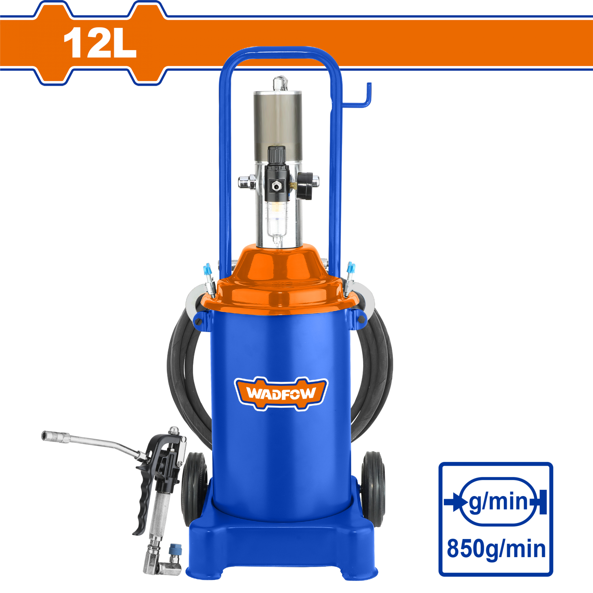 Wadfow Havalı Gres Pompası, endüstriyel ve otomotiv sektöründe ağır hizmet yağlama ihtiyaçlarınız için tasarlanmış güçlü ve verimli bir üründür. 12 L kapasitesi ile kompakt bir kullanım sunar
